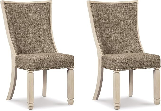 Bring timeless farmhouse charm to your dining space with this set of two upholstered dining chairs. Featuring a two-tone design with a textured antique white finish, these chairs are beautifully crafted from wood and engineered wood for durability. The cushioned backs and seats are upholstered in a heavy woven fabric, offering both comfort and style.